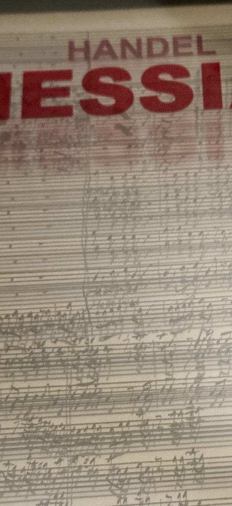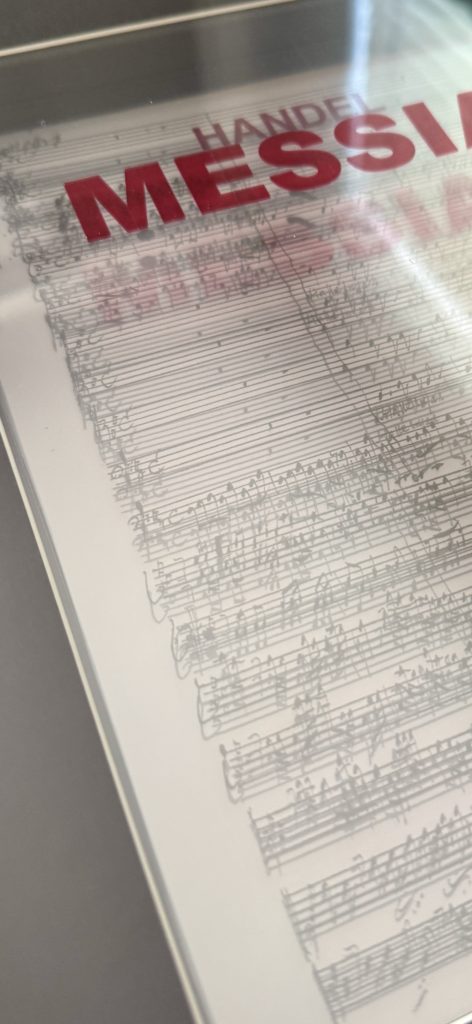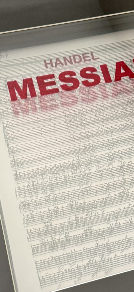 Three-layer Lightfold parallax cassette featuring Handel’s Messiah, built from a base score image paired with two semi-transparent overlays printed on clear plastic. The layers are precisely aligned and spaced inside the frame so the musical staves, handwritten markings, and bold title shift as you change viewing angle, creating depth and subtle motion across the page while keeping the design crisp, graphic, and image-forward for a silent auction fundraiser.